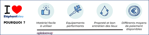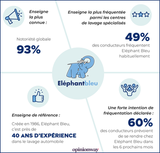 Eléphant Bleu ressort comme l’enseigne de lavage de référence pour 97% des sondés en bénéficiant d’une image forte portée par une marque solide. Attachante et jalonnant les routes depuis 40 ans, elle fait partie du patrimoine national. 95% des clients lui font confiance, 89% la considèrent compétitive, 95% se sentent bien dans ses stations et 86% apprécient son engagement pour l’environnement.