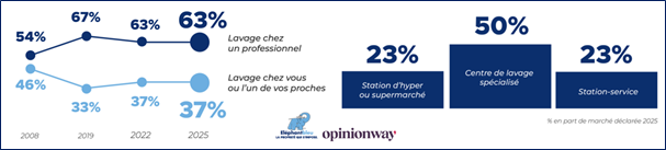 • Les automobilistes se rendent de plus en plus dans les centres spécialisés (1 lavage sur 2), au détriment des stations-services et des supermarchés.