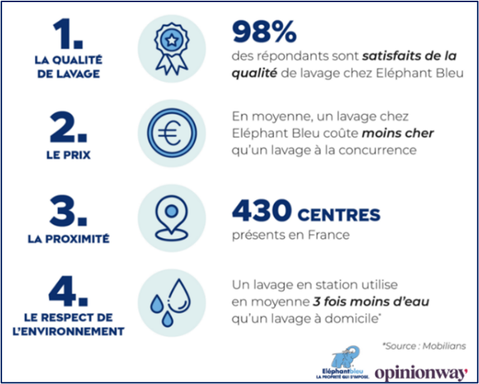 Eléphant Bleu ressort comme l’enseigne de lavage de référence pour 97% des sondés en bénéficiant d’une image forte portée par une marque solide. Attachante et jalonnant les routes depuis 40 ans, elle fait partie du patrimoine national. 95% des clients lui font confiance, 89% la considèrent compétitive, 95% se sentent bien dans ses stations et 86% apprécient son engagement pour l’environnement.